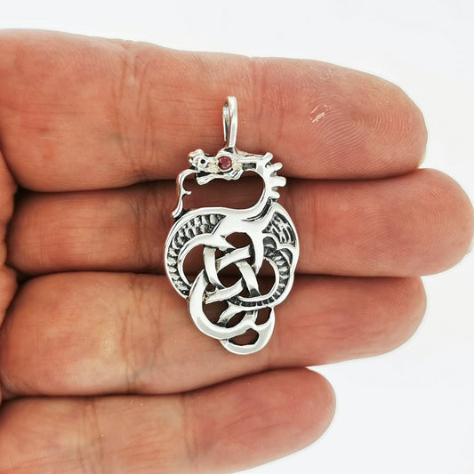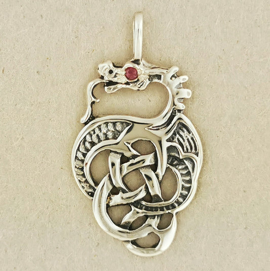 Dragon celtique entrelacé avec oeil rubis en argent sterling