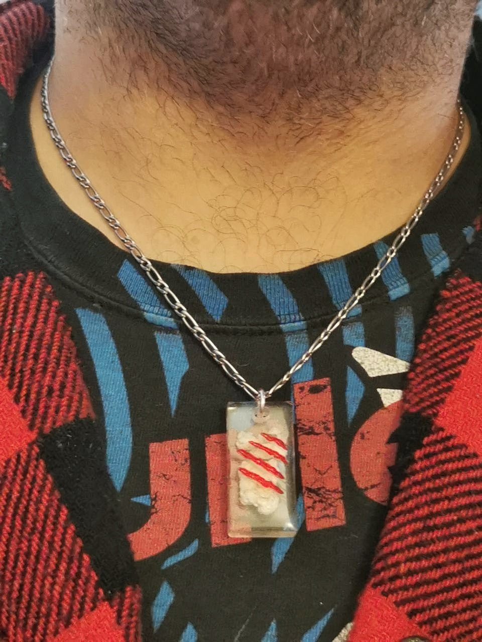 Un de mes amis avait depuis des années un éclat osseux au genou qu'il a finalement fait retirer. Il m'a ensuite demandé d'en faire un pendentif en résine et l'a étiqueté "le visage de son ennemi !"
