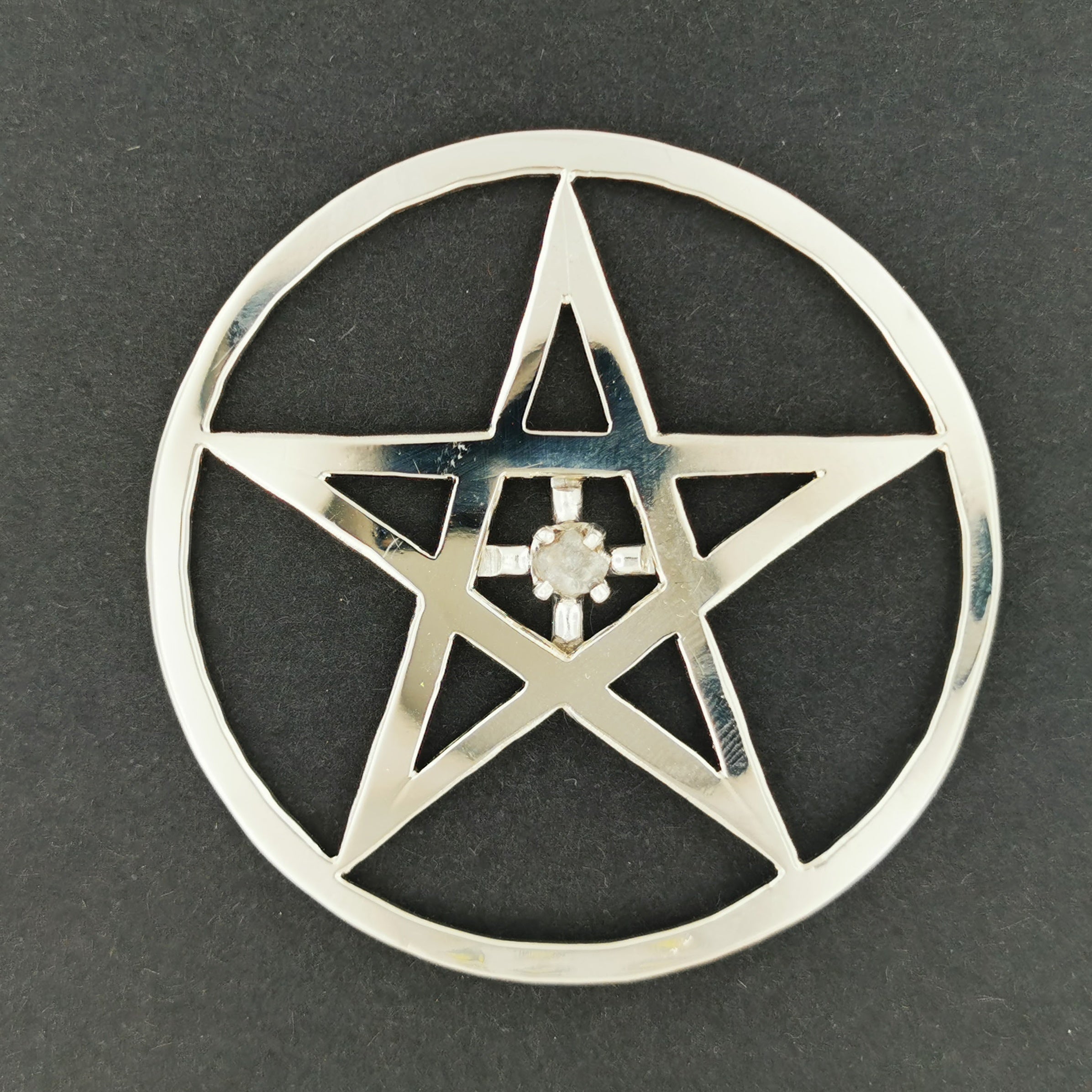 C'était un pentacle en acier que mon ami Tony avait fabriqué et que sa femme Louise a trouvé dans ses affaires après son décès. J'ai pris un diamant brut de 1 carat qu'il possédait et j'ai réalisé une monture personnalisée pour le centre. Il se trouve actuellement sur le devant de son urne.