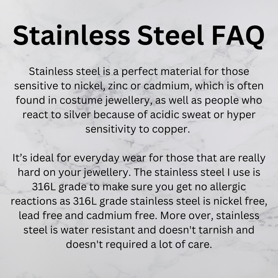 - Stainless steel is an affordable material to create hypoallergenic jewellery for those sensitive to costume jewellery. Stainless steel is a tougher material than gold and silver and is ideal for everyday wear for those that are hard on your jewellery. The stainless steel I use is 316L grade to make sure you get no allergic reactions as 316L grade stainless steel is nickel free, lead free and cadmium free. Moreover, stainless steel is water resistant and doesn't tarnish and doesn't required a lot of care. It does take more work to finish pieces cast in stainless steel and can take longer to get cast, so the processing time is 2-3 weeks depending on the caster.